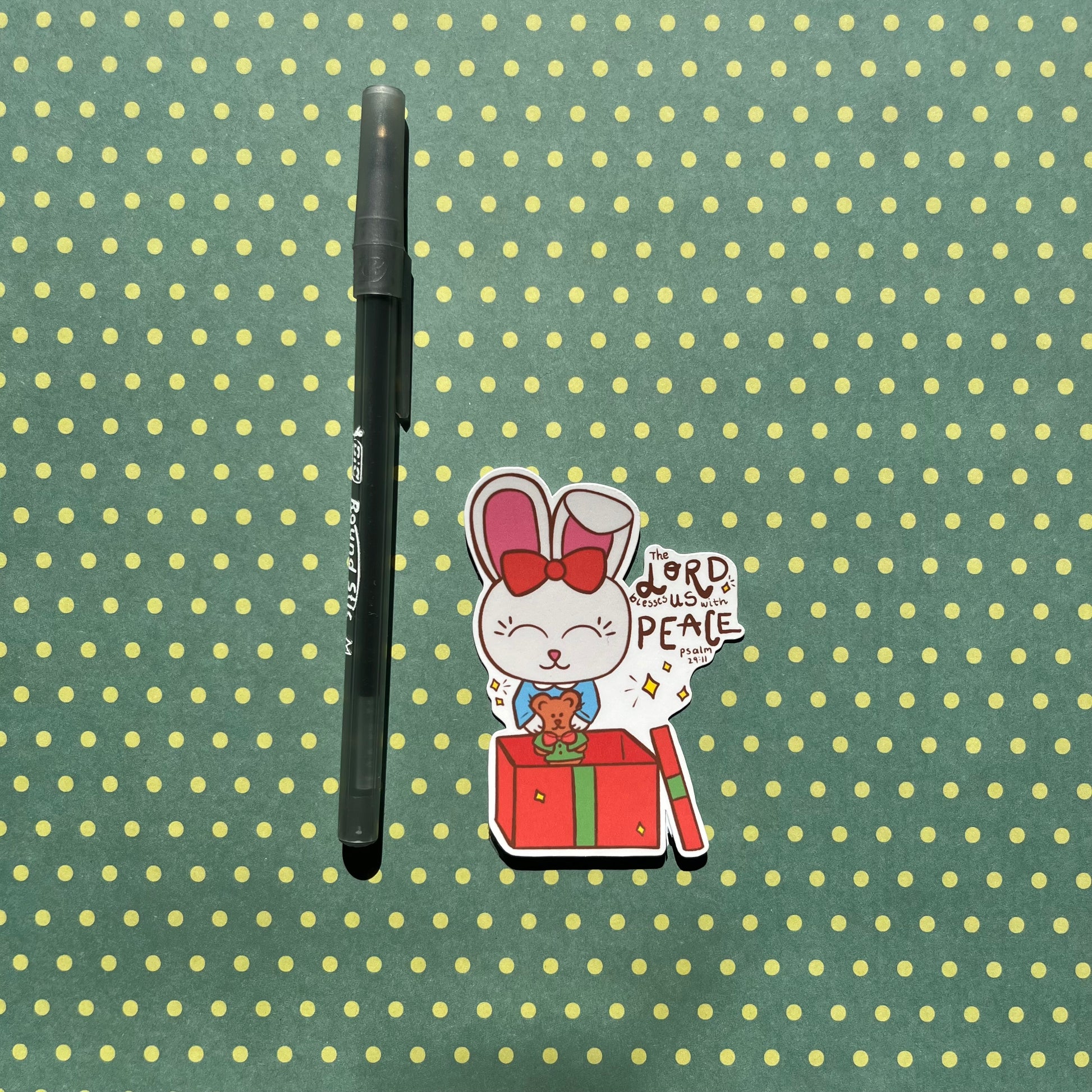 Adorable, kawaii style, handmade sticker of the cutest bunny, Bonni, and a joyful bible verse from Psalm 29:11